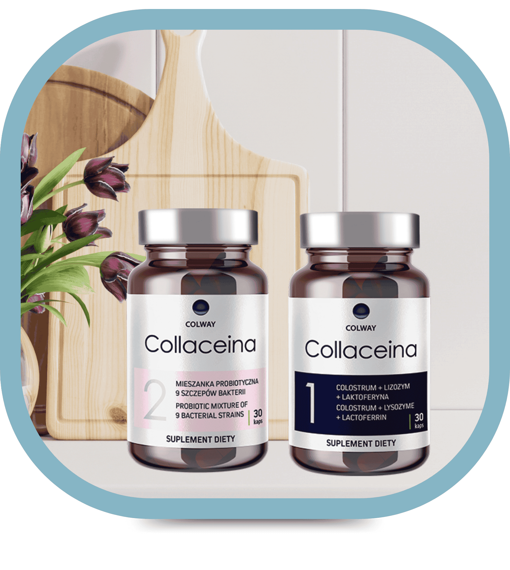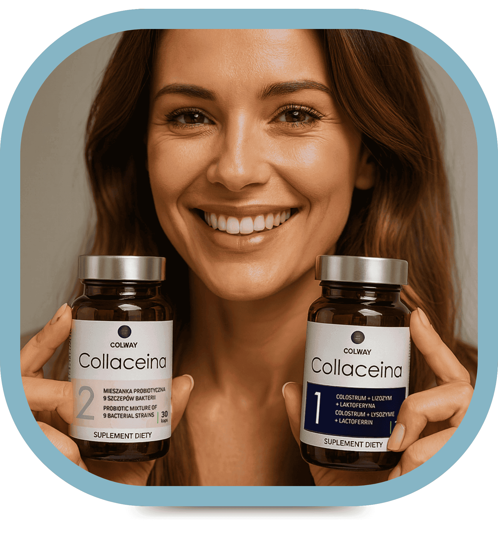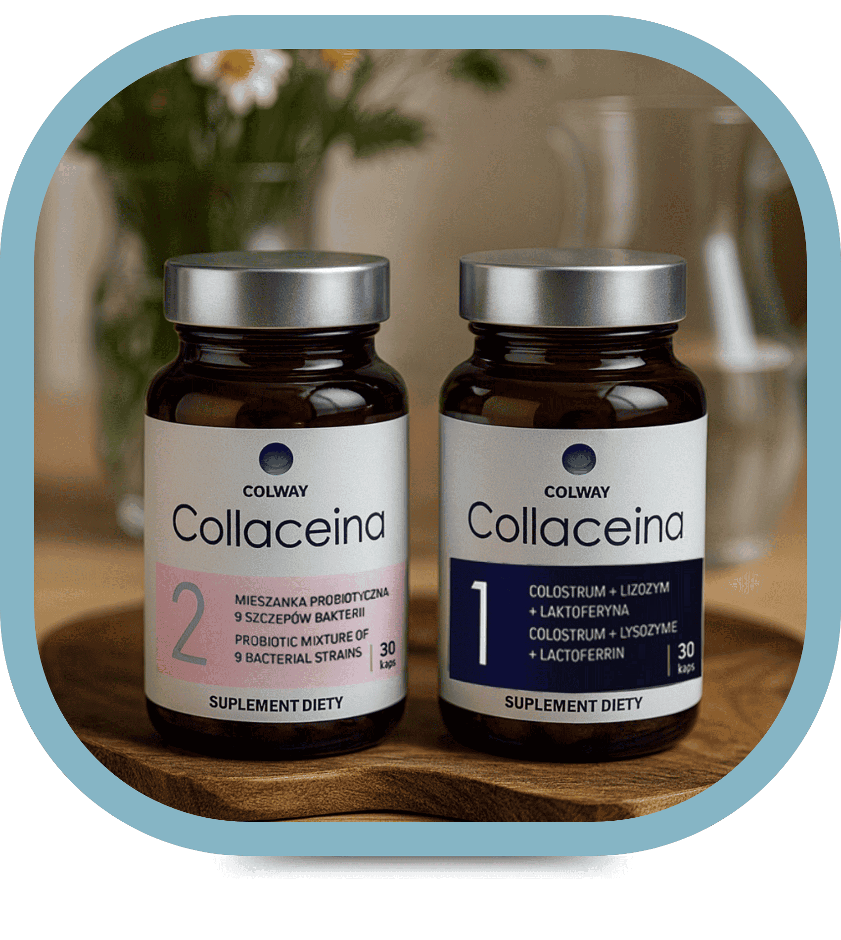 Collaceina Colway to nowoczesny, dwufazowy suplement diety opracowany tak, by działać wtedy, gdy Twój organizm najbardziej potrzebuje wzmocnienia. Łączy colostrum, laktoferrynę i lizozym – składniki pierwszej linii obrony – z mieszanką 9 wyselekcjonowanych szczepów probiotycznych (10 miliardów bakterii CFU), które wspierają florę jelitową, a jelita odpowiadają nawet za 70% odporności.